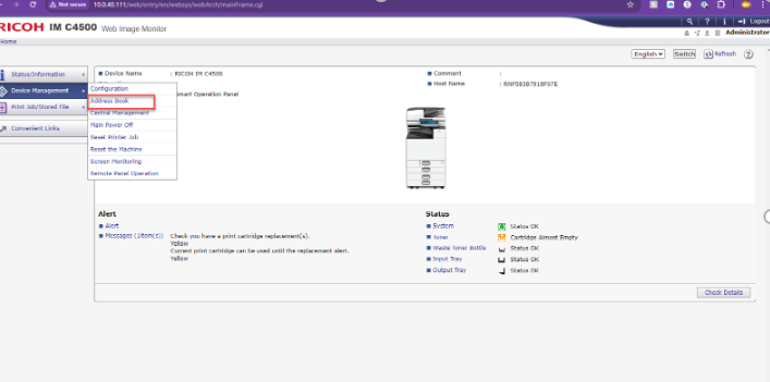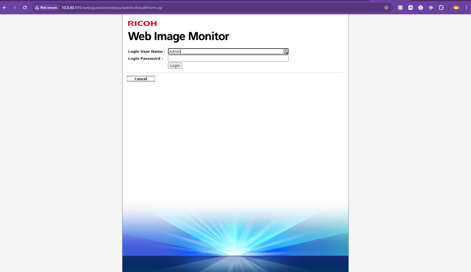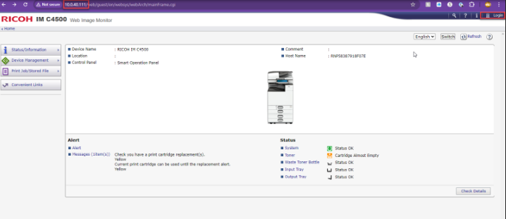 1. Type in the IP address of the Ricoh in your preferred web browser URL bar and press Login at the top right-hand corner of the screen.