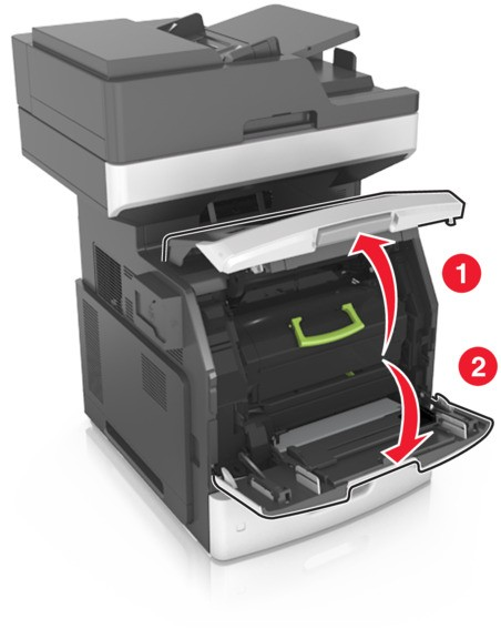 1. Open the Printer: To begin, lift the front cover of your printer and pull down the multipurpose feeder door to access the toner cartridge.